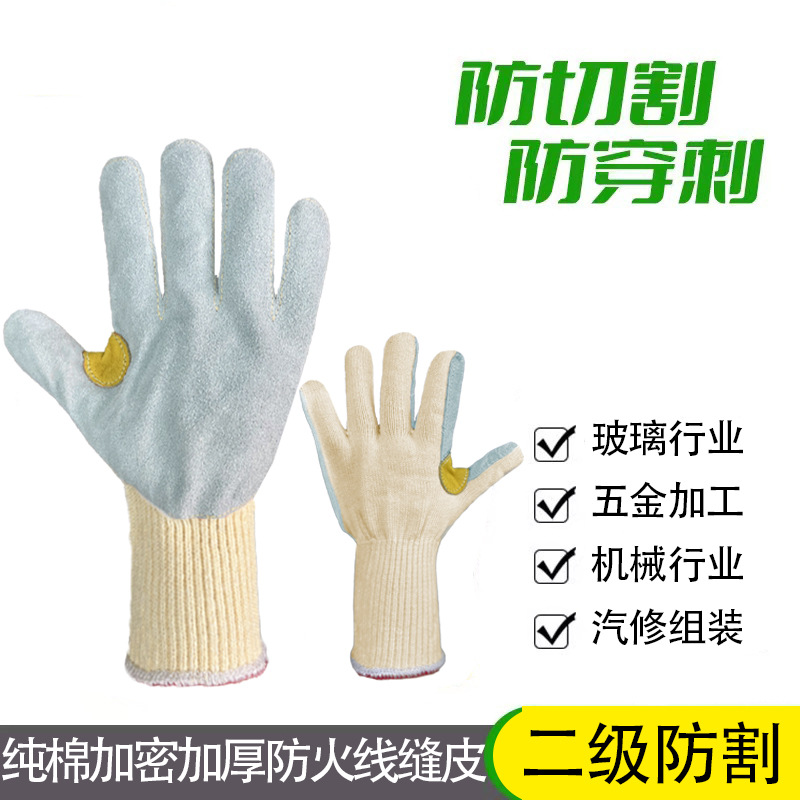 牛头层皮萤光防护条蓝布胶袖手套